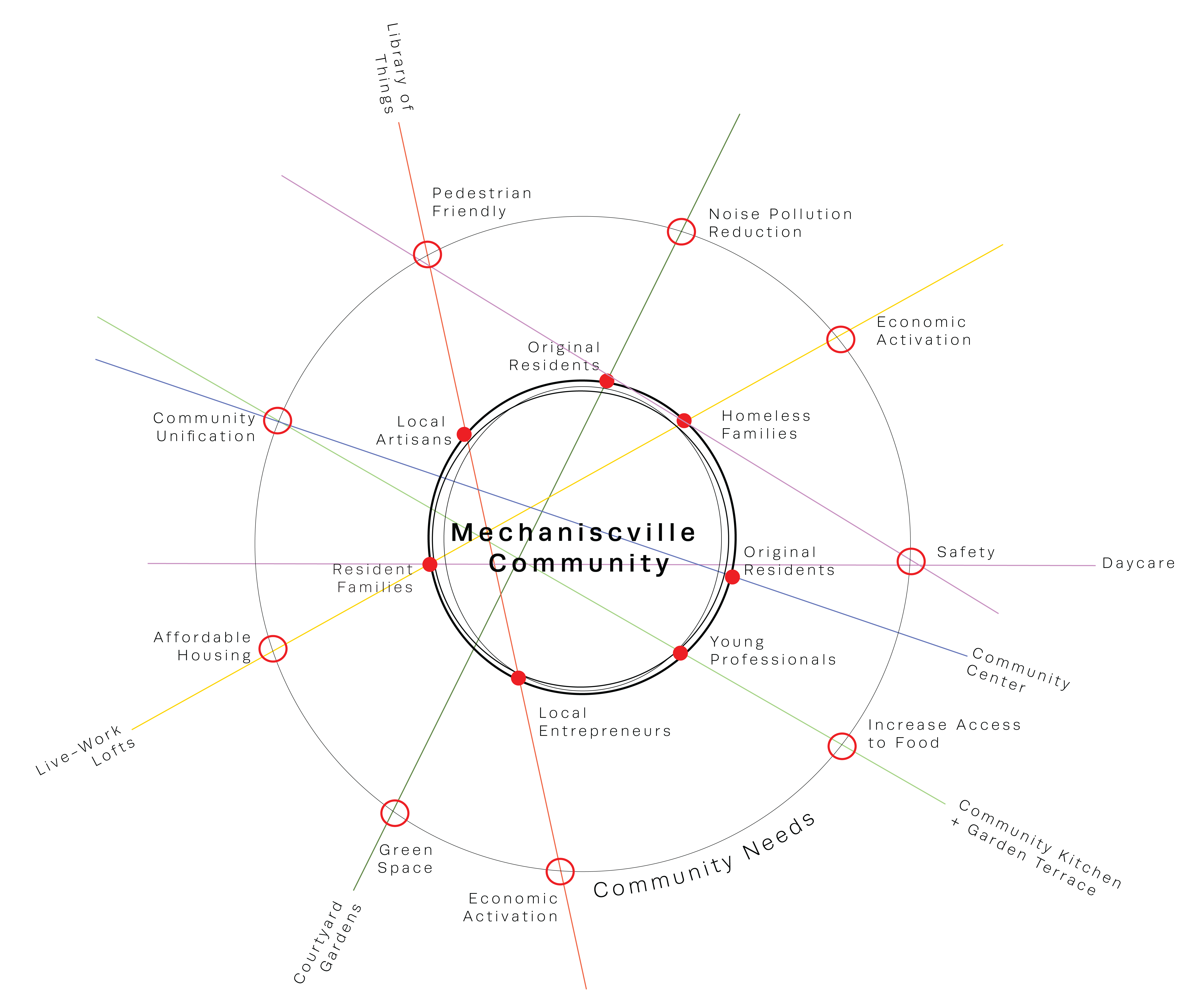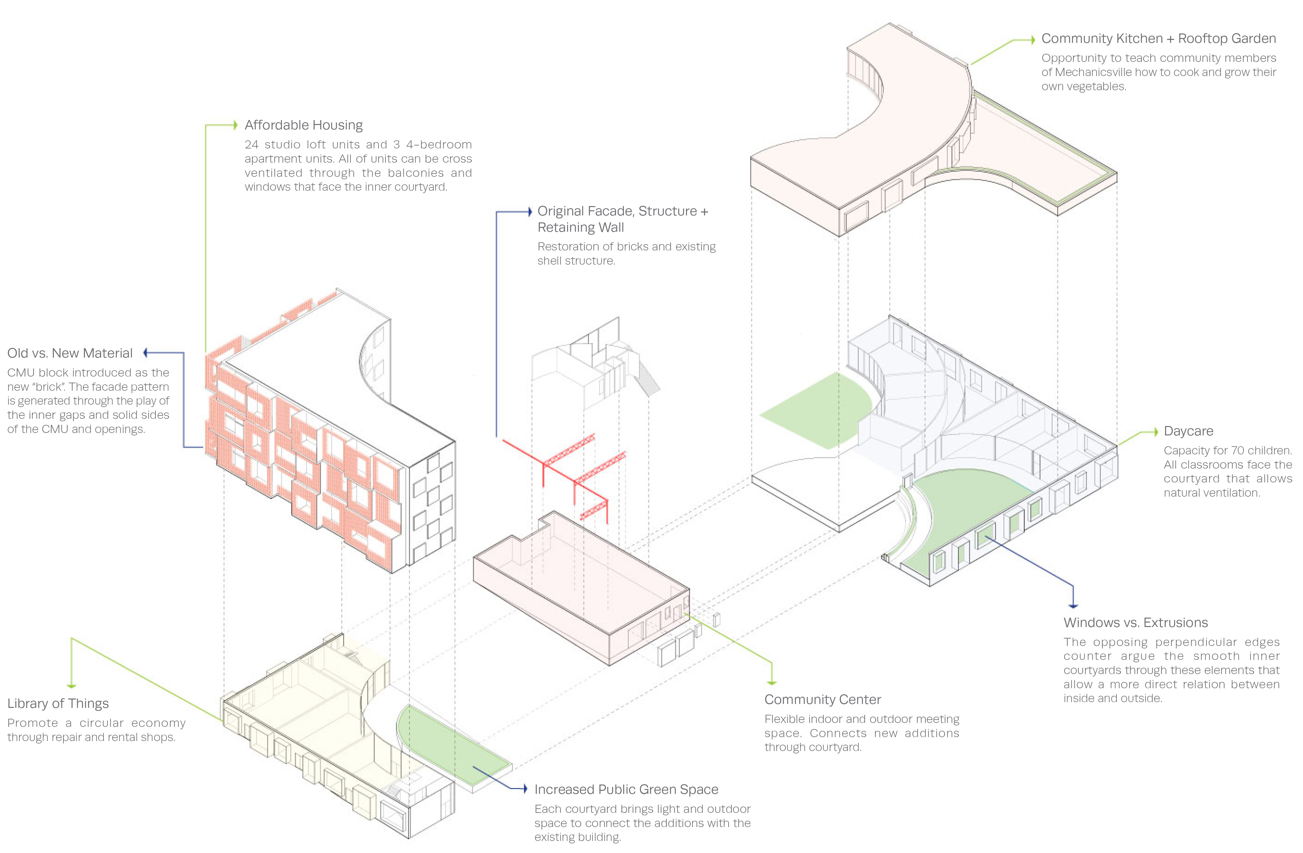Mechanicsville developed its distinct character and history since the late 1800s, by primarily housing locomotive repair men, carpenters, brick masons and their families. However, urban renewal programs in the 1950s pushed out residents and led to the loss of its core identity. Cercle is an attempt to uncover Mechanicsville's original essence by looking at the existing building shells and overall neighborhood as an opportunity to assemble back all the "working parts" of what was once a flourishing community.